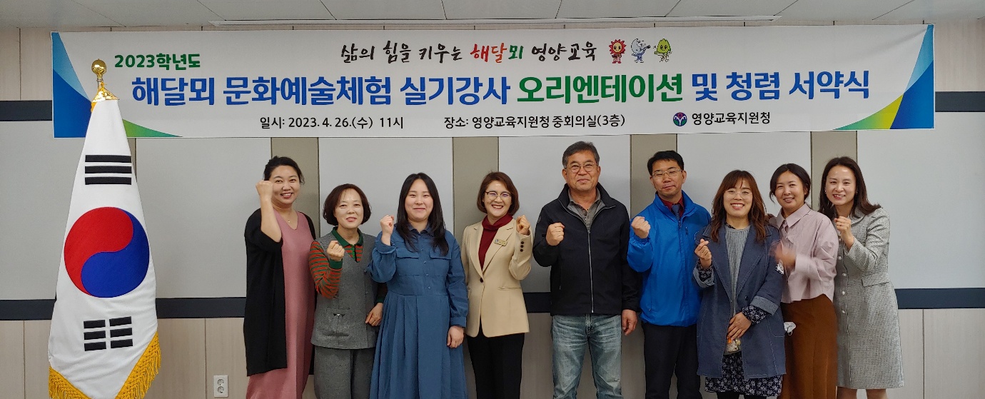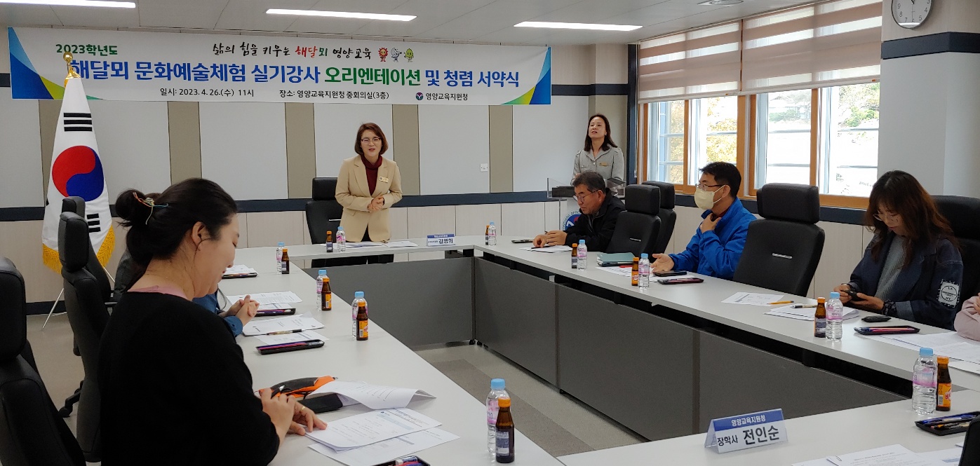 경상북도영양교육지원청은 학생 맞춤형 문화예술교육 강화를 위해 4월 26일 영양교육지원청 3층 중회의실에서 문화예술 실기 강사 9명을 대상으로 오리엔테이션 및 청렴 서약식을 실시하였다.