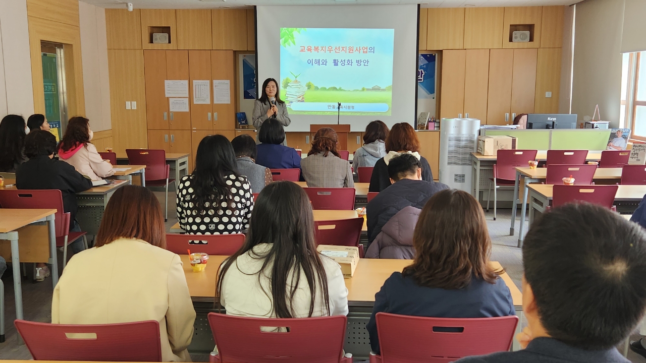 □ 안동교육지원청(교육장 이순호)은 4월 25일부터 27일까지 교육복지우선지원사업 신규 사업선정 학교 및 연수 신청학교 4개 학교 200여명을 대상으로 찾아가는 교직원 연수를 실시하였다.