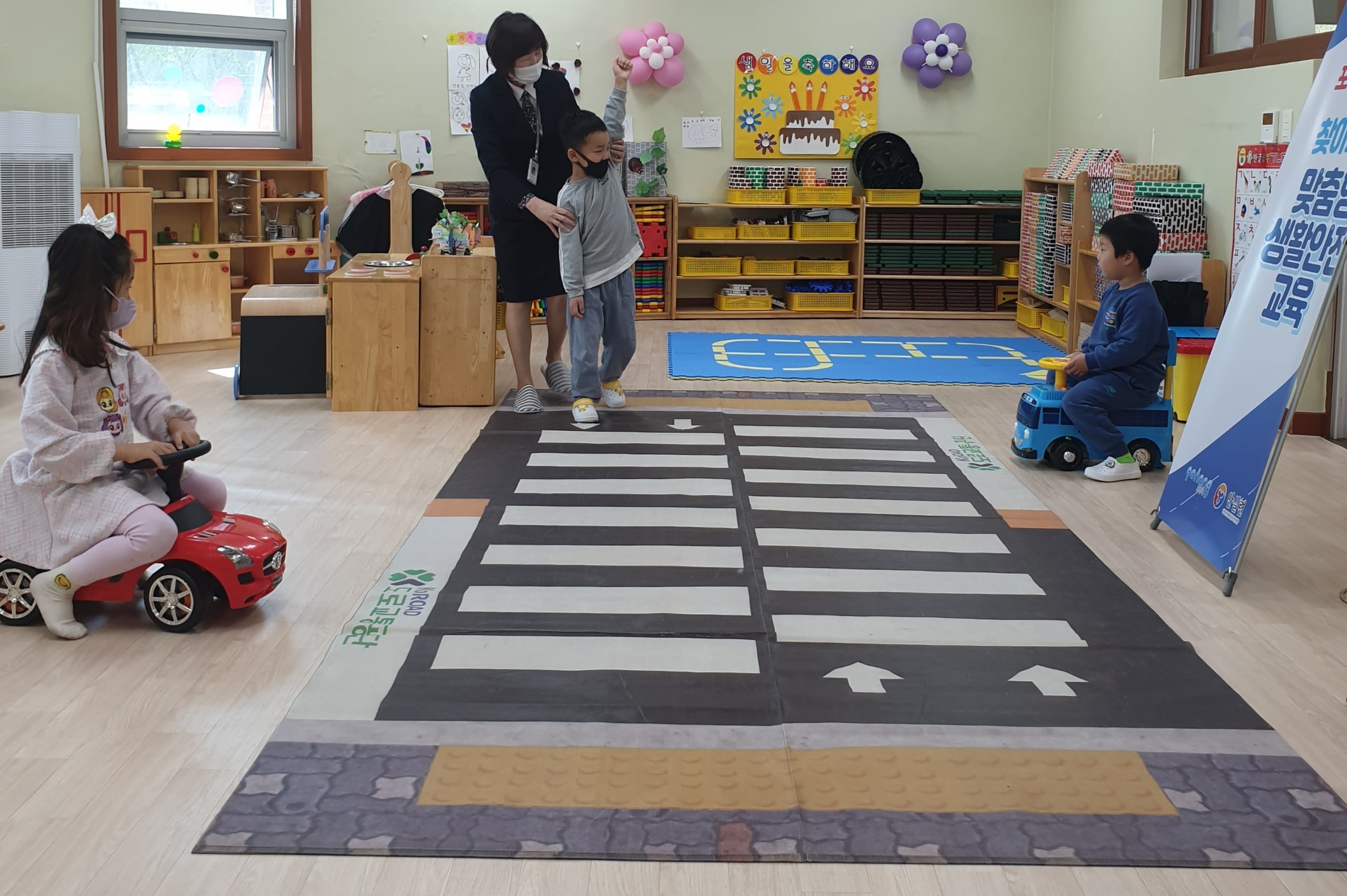 먼저 ‘뛰뛰빵빵 안전송’노래를 부르며 시작하여 보행안전(차도, 보도, 신호등)과 바퀴 달린 탈것(자전거, 인라인)의 보호장구와 자동차에서 안전띠 착용방법 등을 알아보았다. 모형 신호등과 횡단보도 앞에서 “선다-본다-손을 든다-확인한다-눈을 맞추며 건넌다”는 횡단보도 건너기(5가지 약속)을 연습하고 보행자신호가 될 때 까지 기다렸다가 초록불이 되면 횡단보도를 안전하게 건너는 실습을 하였다.