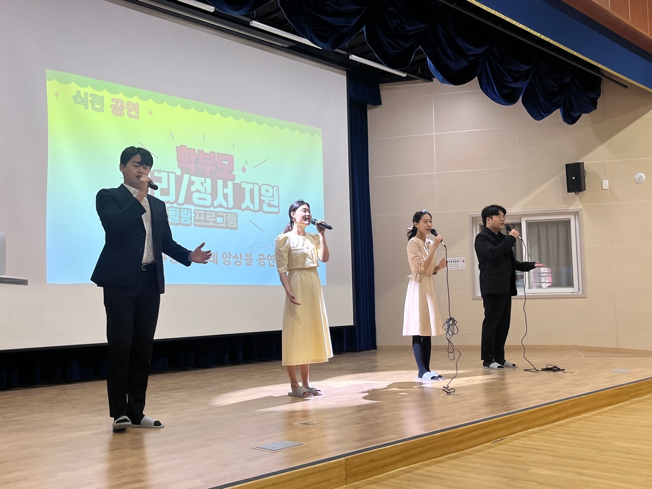 당일 행사 시작 전 강당에서 학부모 심리·정서 지원 힐링 프로그램으로 ‘성악4중창 마레앙상블’ 공연을 관람하였다. 이어서 아동학대 예방 안전교육을 실시하였다. 그 내용으로는 아동학대의 정의, 유형, 아동학대의심 징후, 아동학대 신고 요령 등 이었다. 다음으로 각 반 교실로 이동하여 학부모참여수업을 진행하였다.