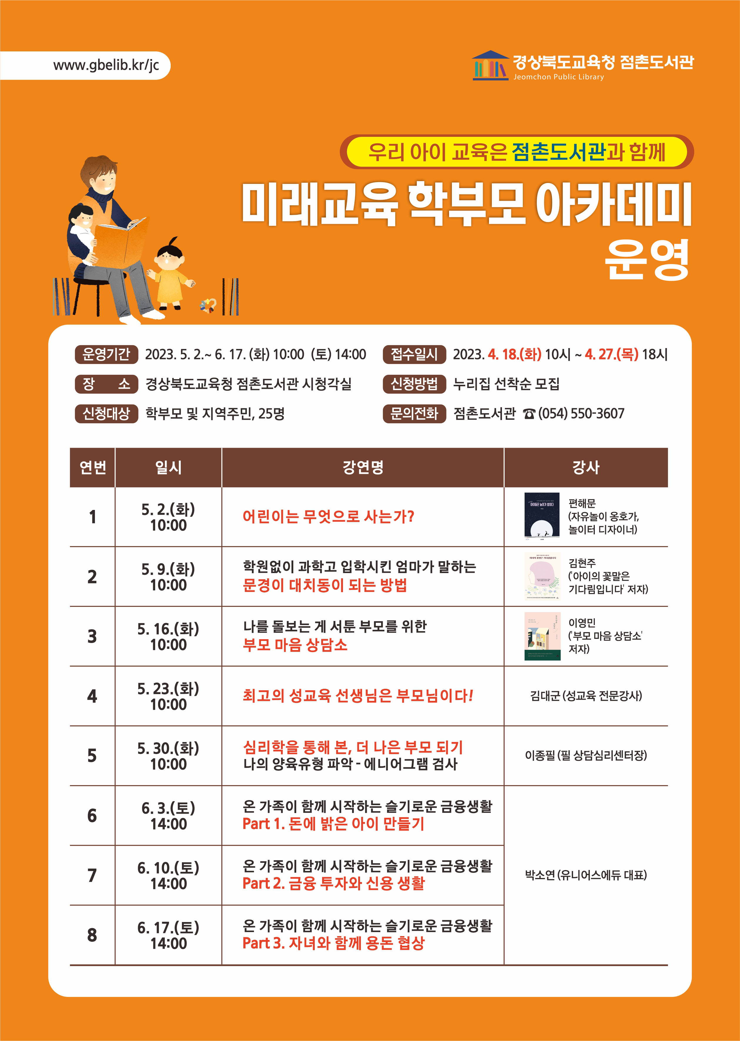 □ 이어서 ▲‘아이의 꽃말은 기다림입니다’의 김현주 작가의 ‘(학원없이 과학고 입학시킨 엄마가 말하는) 문경이 대치동이 되는 방법’▲이영민 작가의 ‘(나를 돌보는 게 서툰 부모를 위한) 부모 마음 상담소’▲사람이니까 성교육 김대군 대표의 ‘최고의 성교육 선생님은 부모님이다!’▲필 상담심리센터 이종필 센터장의 ‘심리학을 통해 본, 더 나은 부모 되기’ ▲ 금융&교육 전문 회사 유니어스에듀 박소연 대표의 ‘온 가족이 함께 시작하는 슬기로운 금융 생활’강연으로 총 8회 운영 될 예정이다. 특히 8회차 강의는 ‘우리카드와 함께하는 찾아가는 금융 교육’지원을 받아 운영된다.