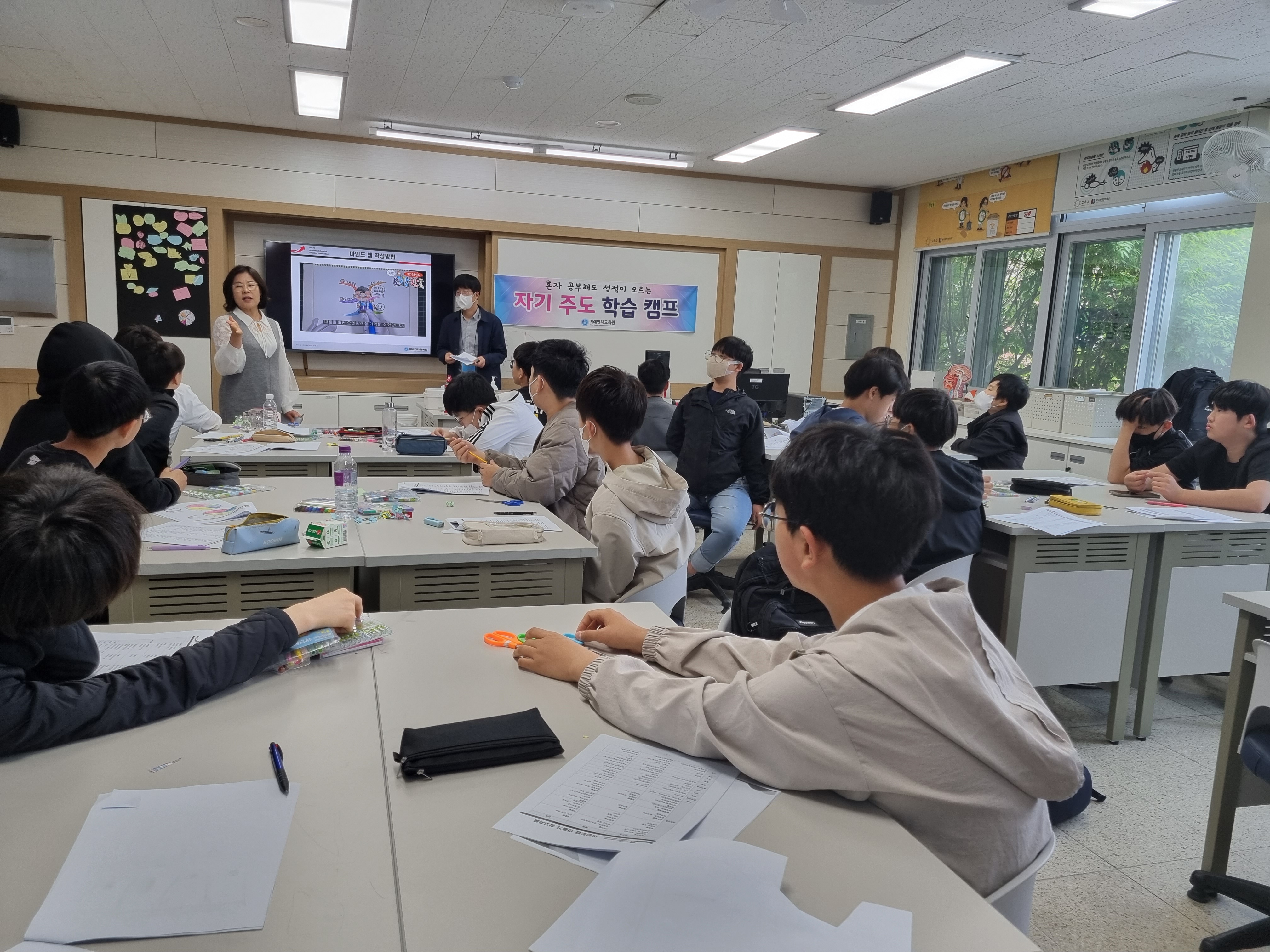 □ 자기주도학습 진로캠프는 학생들이 자기이해를 기반으로 하여 진로 목표를 설정하게 하고 자기주도적으로 학습을 해나갈 수 있는 역량을 기를 수 있도록 하고자, 자기주도학습에 필요한 학습 동기와 공부 방법 등에 대해 체계적으로 교육하였다. 동기부여전략, 나의 공부법 진단 검사, 공부환경 개선과 시간 관리, 공부 전략, 학습계획표 작성하기 5차시로 진행되었다. 캠프에 참가한 학생들은 ‘나의 공부 이유’ 트리 만들기, 성공한 사람들의 학습습관 사례 분석, 공부 방해요인 찾고 해결방법 토론하기, 메타인지 활용하기 등의 활동에 적극 참여하는 열의를 보였다. 1학년 1반 오○○학생은 중학교 입학해서 초등학교와는 다른 학교 생활과 공부에 대해 불안감이 있었는데 캠프를 계기로 자신에게 맞는 올바른 학습 방법을 찾을 수 있었고, 내 시간의 주인이 되어 학교 생활과 공부를 하여야겠다는 소감을 밝혔다.