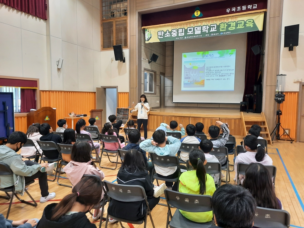 우곡초등학교(교장 윤주학)는 지난 4월 28일(금) 경상북도환경연수원의 전문강사를 초빙하여 전교생을 대상으로 탄소중립모델학교 환경교육을 실시하였다.