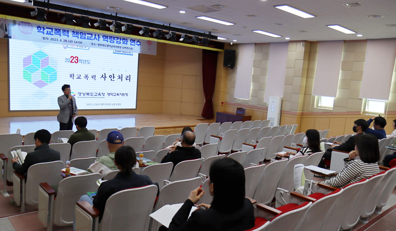 경상북도영덕교육지원청(교육장 박재식)은 2023년 4월 28일(금) 1층 초연관에서 관내 초·중·고등학교 학교폭력 책임교사 및 업무담당자 21명을 대상으로 현장 중심 학교폭력 근절 대책에 대한 이해와 학교폭력 사안 발생 시 충분한 매뉴얼 숙지를 통하여 정확하고 신속한 대응체계를 확립할 수 있도록 역량 강화 연수를 실시하였다.