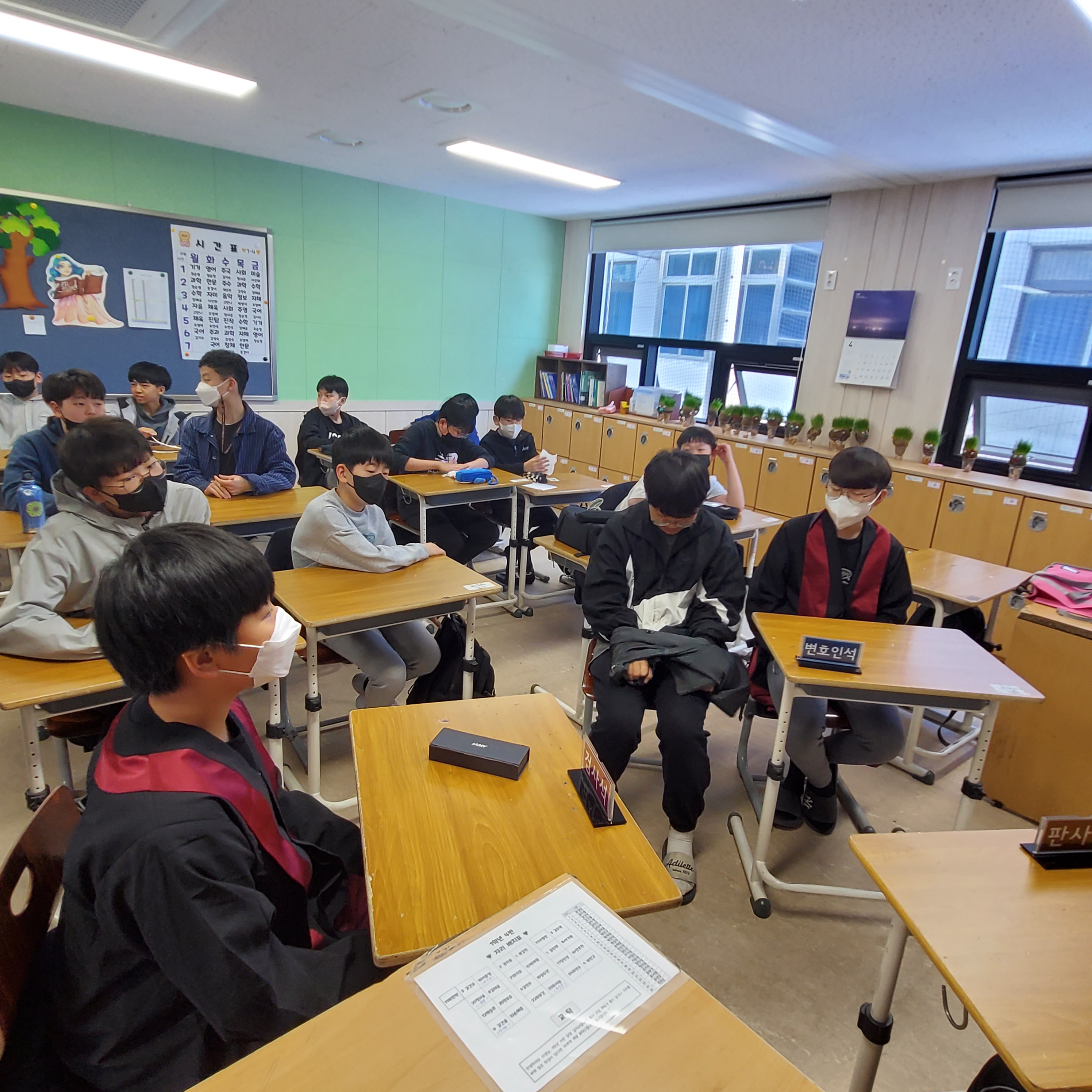 □ 변호사 특강(강상택, 강주오)에서 학생들은 법조인의 장단점과 특이사항, 재판의 종류와 판사, 검사, 변호사가 되기 위한 진학 방향과 자격요건 등 법조인과 관련된 구체적인 정보를 알게 되었으며, 조별로 나누어 폭행 사건을 주제로 한 국민 참여 재판형 형사 모의재판을 통해 재판 개정선언을 비롯한 진술 거부권 고지나 배심원들에 대한 설명, 검사 피고인에 대한 진술, 피고인 신문, 검사 최종의견 배심원의 평의 판결, 양형에 대한 토의를 거친 재판장의 선고를 실제 학생들이 진행하도록 하였다.