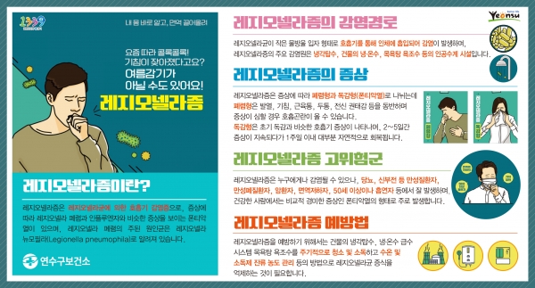 연수구보건소 관계자는 “지역주민의 여름철 호흡기 감염병 예방과 확산방지를 위해 철저한 환경 및 위생관리를 지도하는 데에 노력하겠다”며 “가정 내에서도 에어컨을 가동하기 전에 반드시 주기적인 청소와 환기를 할 것”을 당부했다.