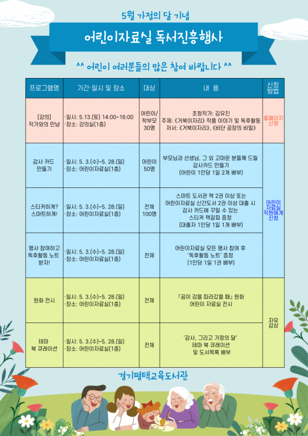 [금요저널] 경기평택교육도서관은 5월 가정의달을 맞아 관내 어린이 및 학부모들을 대상으로 ‘행복한 우리집, 책읽는 어린이와 함께하는 독서진흥행사’를 진행한다.