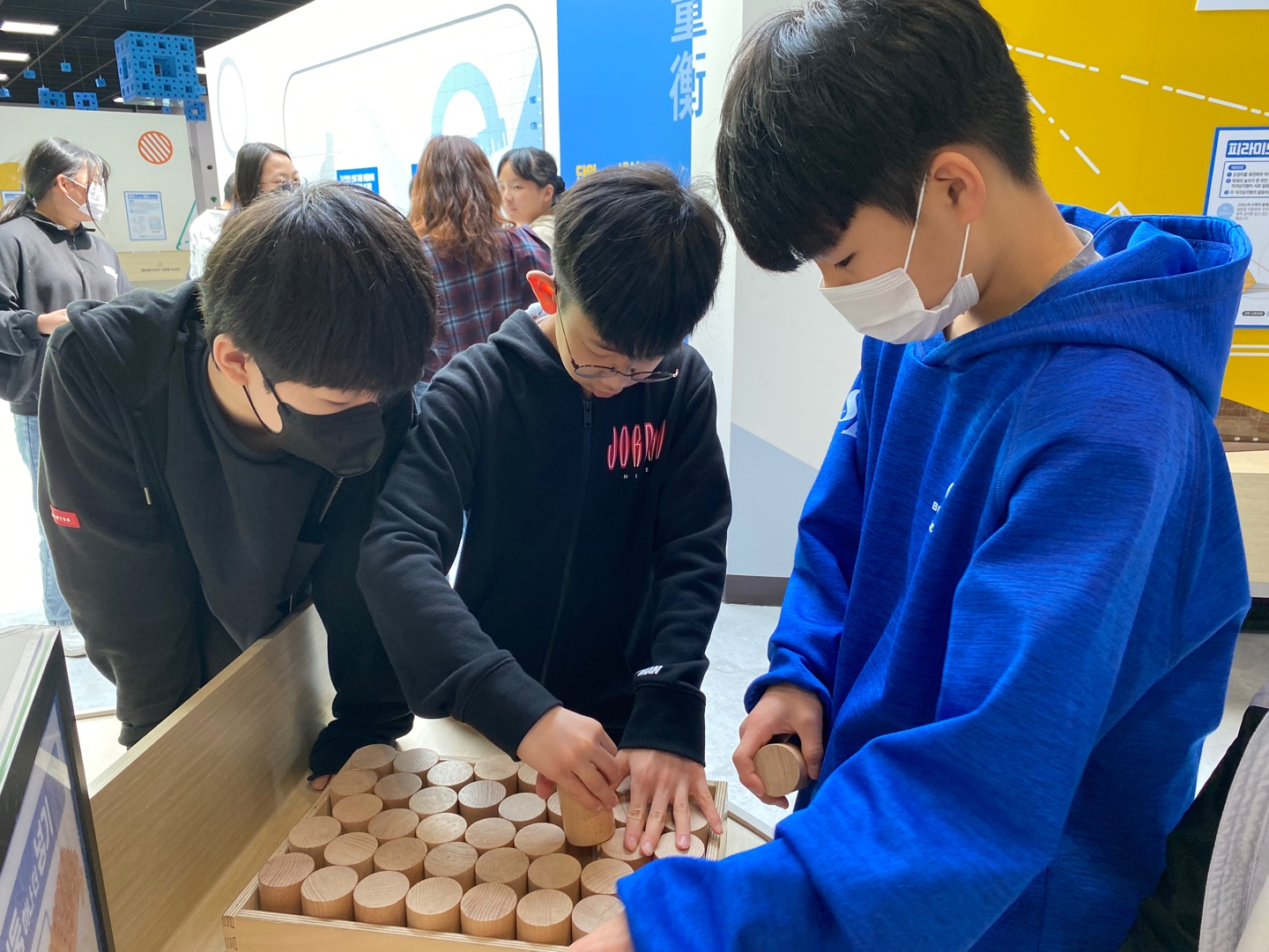 □ 체험활동에 인솔교사로 참가한 김원옥(의흥중 수학 교사) 선생님은 전시체험관에서 기하학 도형 퍼즐-원기둥 하나 더 넣기-을 맞추고자 애쓰는 학생들에게 육각형의 비밀을 설명하면서 “어려운 교실 속 수학 시간보다 체험관에서 학생들이 오감으로 경험하는 수학이 더 소중한 경험이다”라고 말했다.