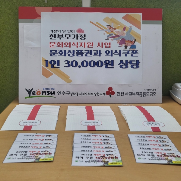 [금요저널] 연수구 청학동 지역사회보장협의체는 지난 2일 한부모가정 문화·외식 지원 사업으로 지역 내 한부모가정 16가구에 문화상품권 및 외식쿠폰을 전달했다.