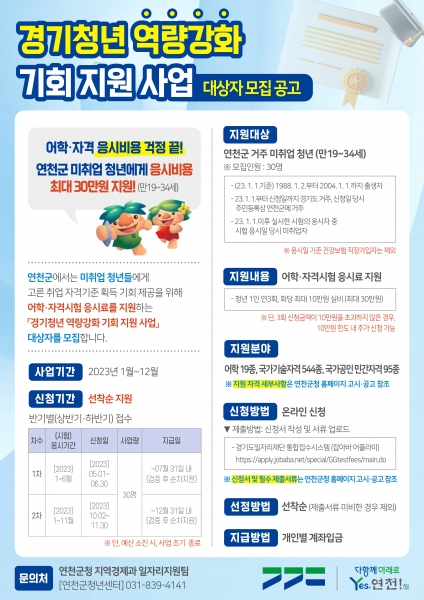 대상자는 연천군 거주 미취업 청년(만19~34세)으로 1988년 1월 2일생부터 2004년 1월 1일생까지다, 시험 응시일은 2023년 1월 1일 이후 시험 응시자부터 신청 가능 하다.
