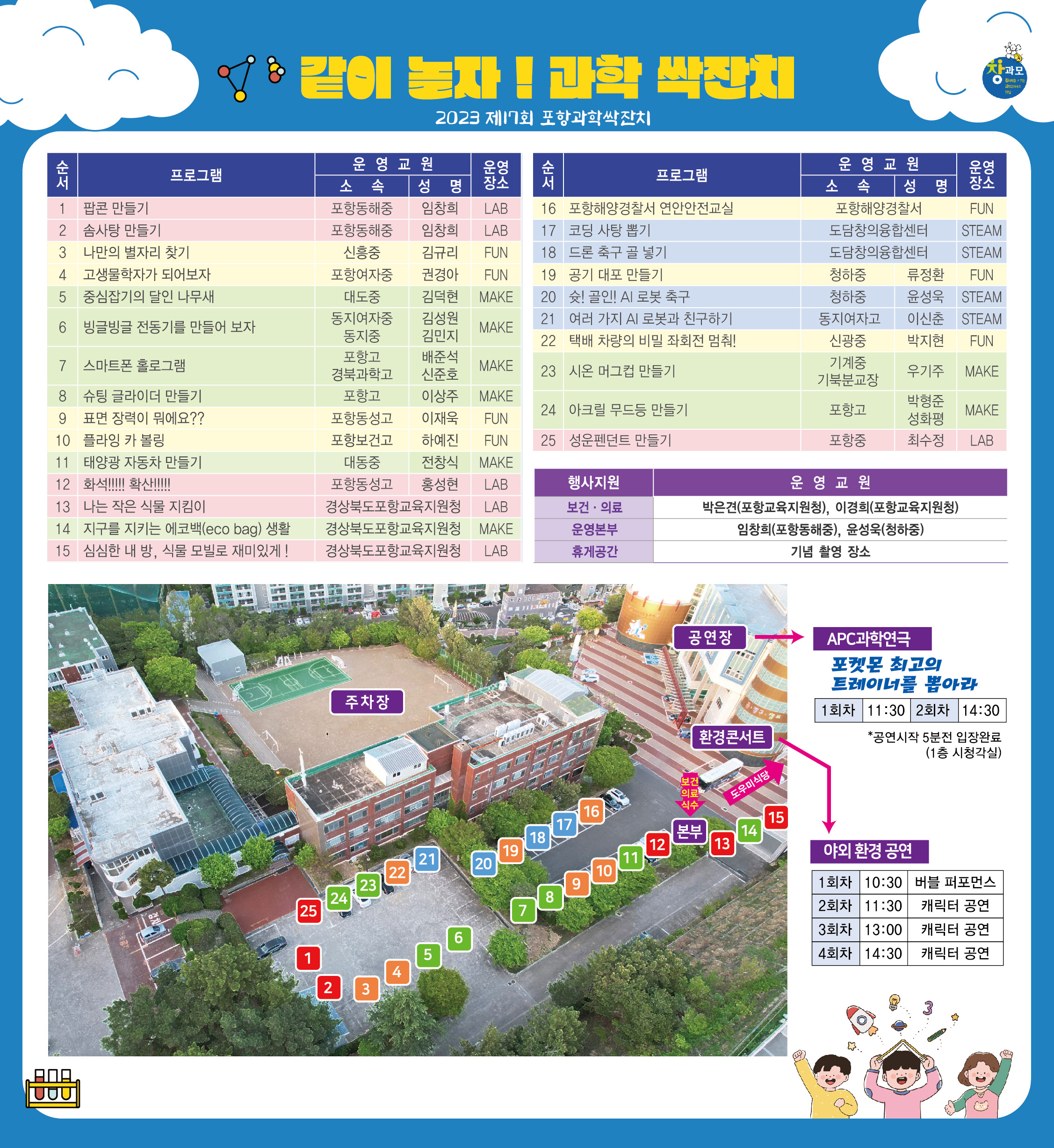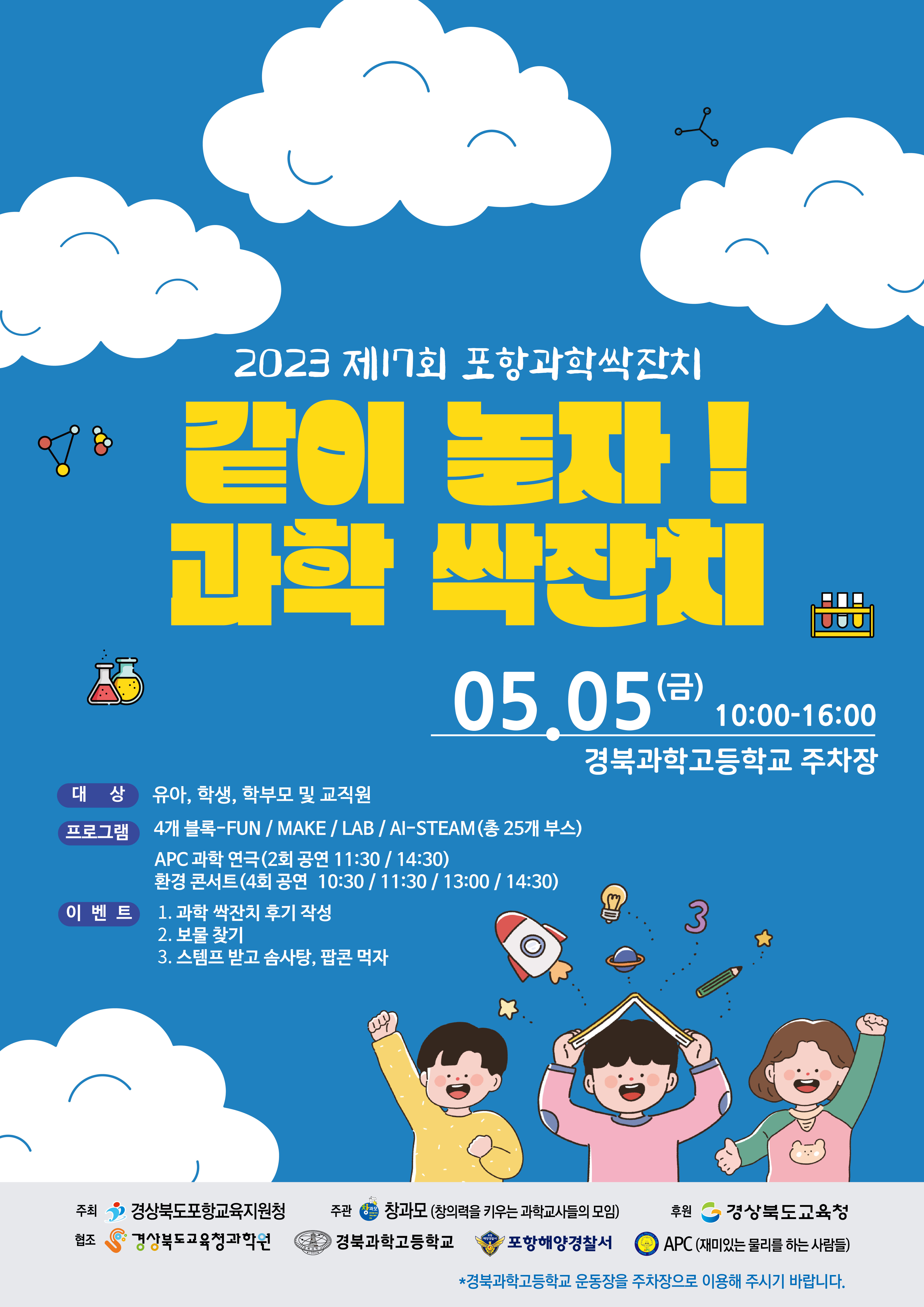 경상북도포항교육지원청(교육장 천종복)이 주최하고 창과모(창의력을 키우는 과학교사들의 모임)가 주관하는 2023 제17회 포항과학싹잔치가 즐거운 어린이날을 맞이하여 5월 5일(금)에 경북과학고등학교에서 코로나 이후 4년 만에 개최된다.
