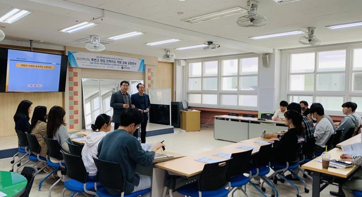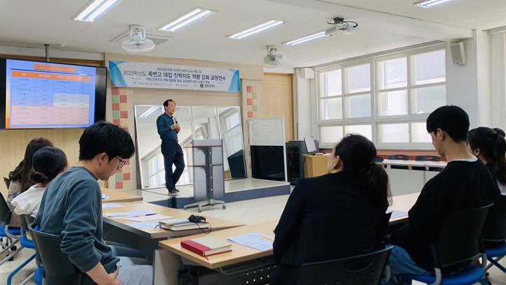 □ 죽변고등학교(교장 배호식)는 5월 2일(화) 정기고사 오후 시간을 활용하여 ‘대입 진학지도 역량 강화 교원연수’ 행사를 본교 창의융합실에서 실시하였다. 이 행사는 교사들이 2024학년도 및 이후 입시 환경과 대입 교과 및 종합 전형에서의 교사의 역할을 이해하여, 교사들의 진학지도 역량 강화 및 학생들의 대입 전략을 구현하여 공교육 신뢰를 갖추고자 하는 취지에서 비롯되었다.