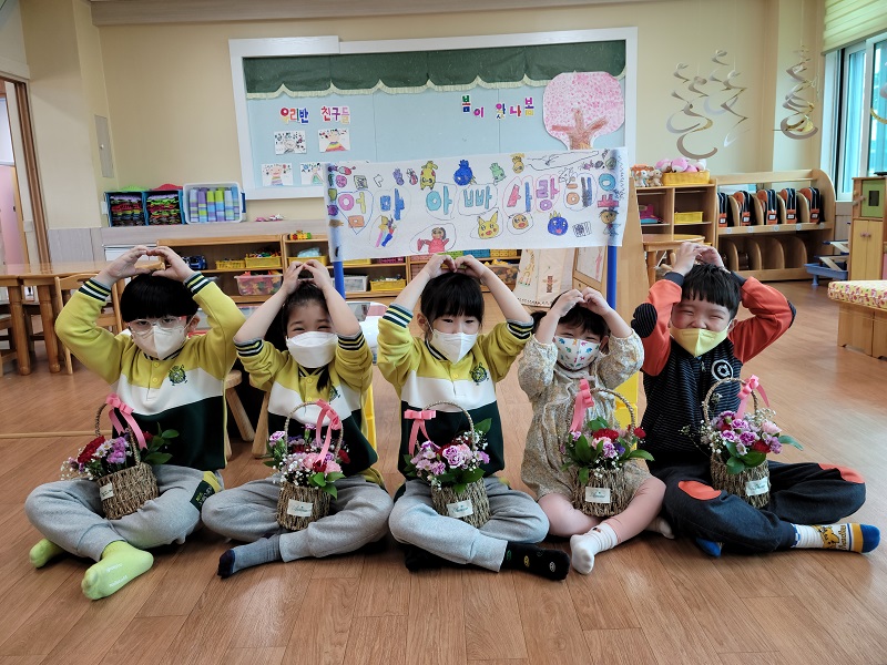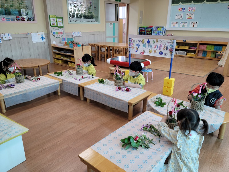 유아들과 부모님께 감사의 마음을 전하는 다양한 방법에 대해 알아보고, 카네이션 등 다양한 꽃의 향기를 맡아보며 오감을 활용해 꽃을 탐색했다. 고사리 같은 손으로 직접 꾸민 꽃바구니를 받고 기뻐할 부모님의 모습을 상상하며 진지한 모습으로 활동에 참여했다.