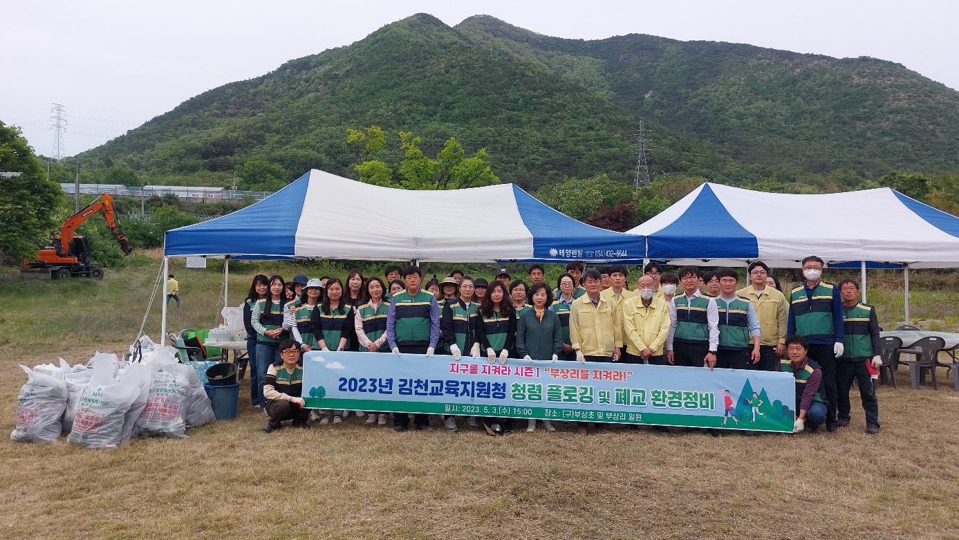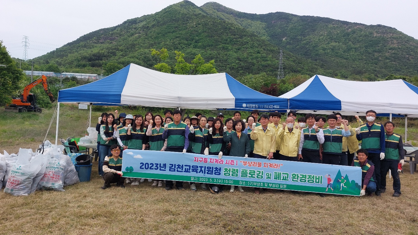 □ 경상북도김천교육지원청(교육장 공현주)은 5월 3일(수) 15시 부터 18시까지 김천시 남면 부상리에 위치한 (구)부상초등학교 부지에서 김천교육지원청 전 직원이 참여한 가운데 폐교 환경정비와 지역 청렴 플로깅을 실시했다.