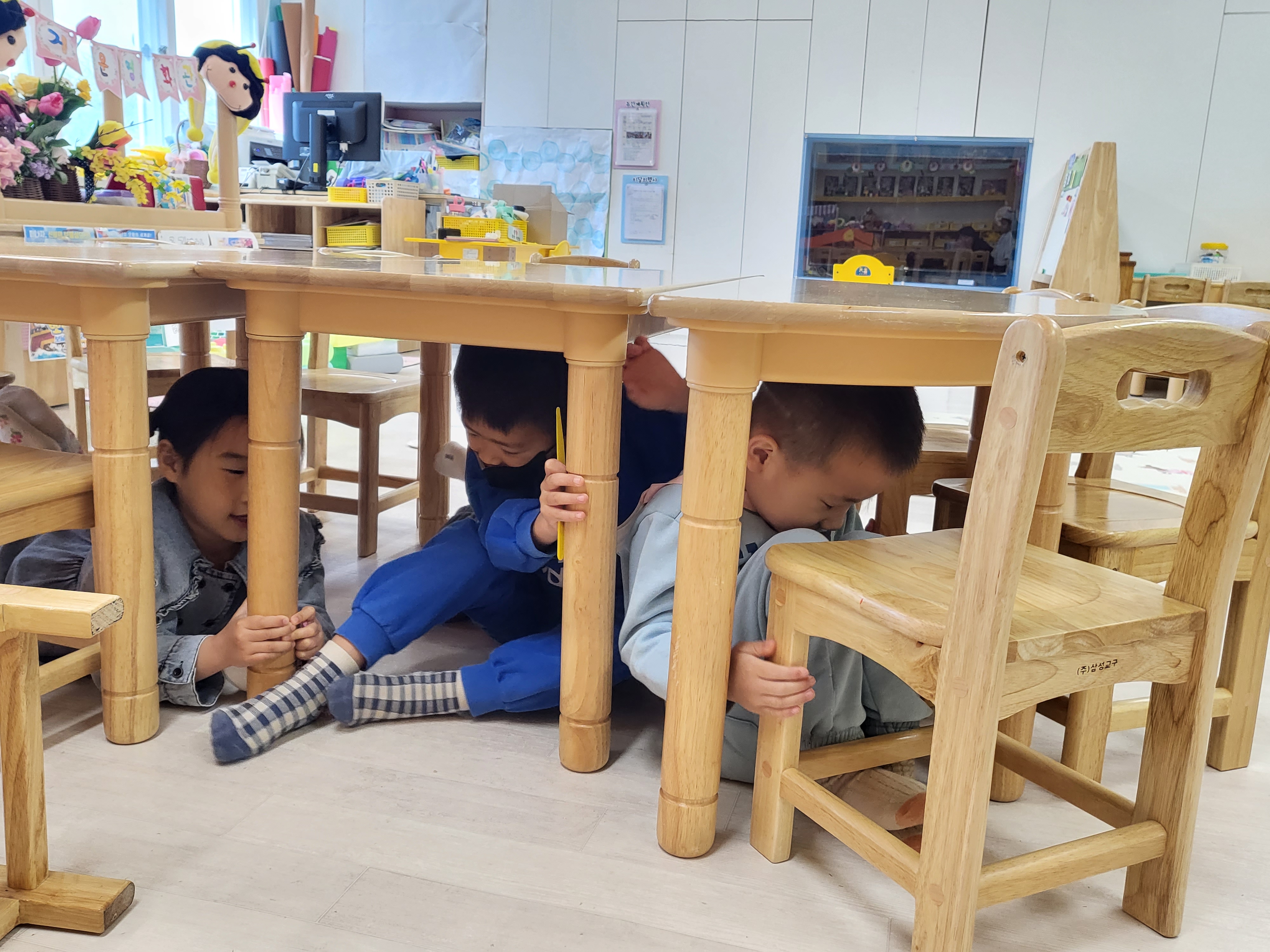 □ 10시 15분경 지진 상황을 알리는 경보 사이렌 소리가 울리자 각반의 유아들은 침착하게 책상 밑으로 머리를 숙이고 책상다리를 붙잡고 지진이 멈췄다는 신호를 주자 책상 밑에서 나왔다. 그리고 신속하게 교사의 지시와 안내로 실내화만 신고 재빨리 유치원 뒤편 공터로 빠르게 대피해 보는 훈련에 참여하였다.