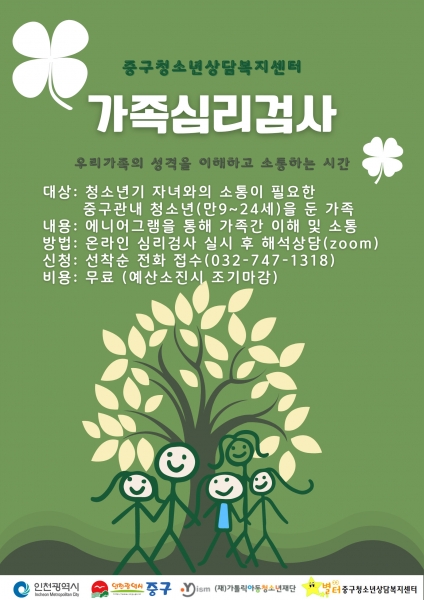 중구청소년상담복지센터는 현재 가족심리검사 참여자를 모집 중으로 대상은 중구 구민 중 청소년을 둔 가족이다.
