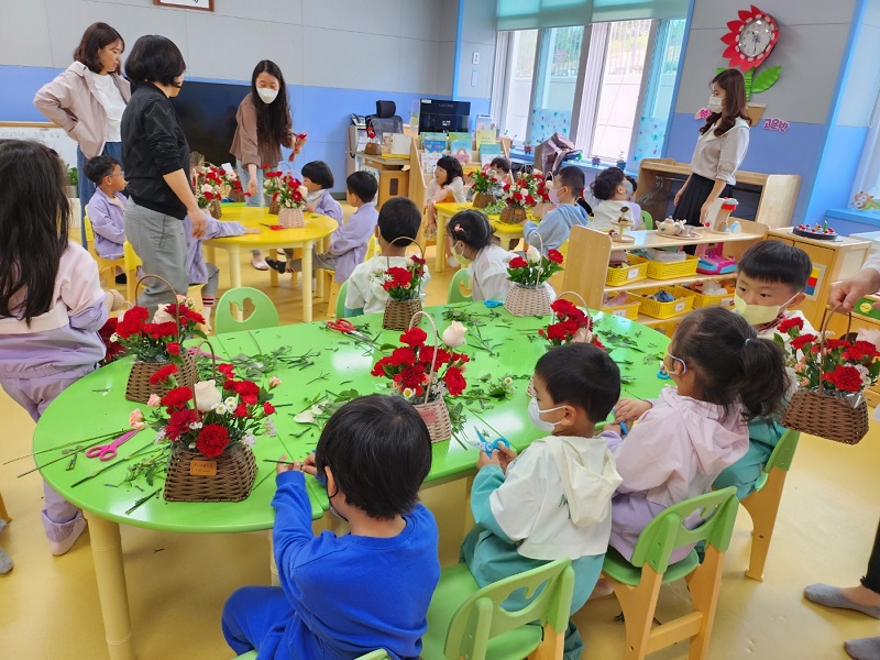 □ 플로럴폼이 담긴 화분 바구니에 카네이션과 여러 종류의 꽃들을 조화롭게 꽂아 정성스럽게 장식을 하였다. 감사의 마음을 담은 카드도 적어서 함께 장식을 한 후 “엄마, 아빠께 드리면 좋아하실 것 같아요!”라며 유아들은 함박웃음을 지었다.