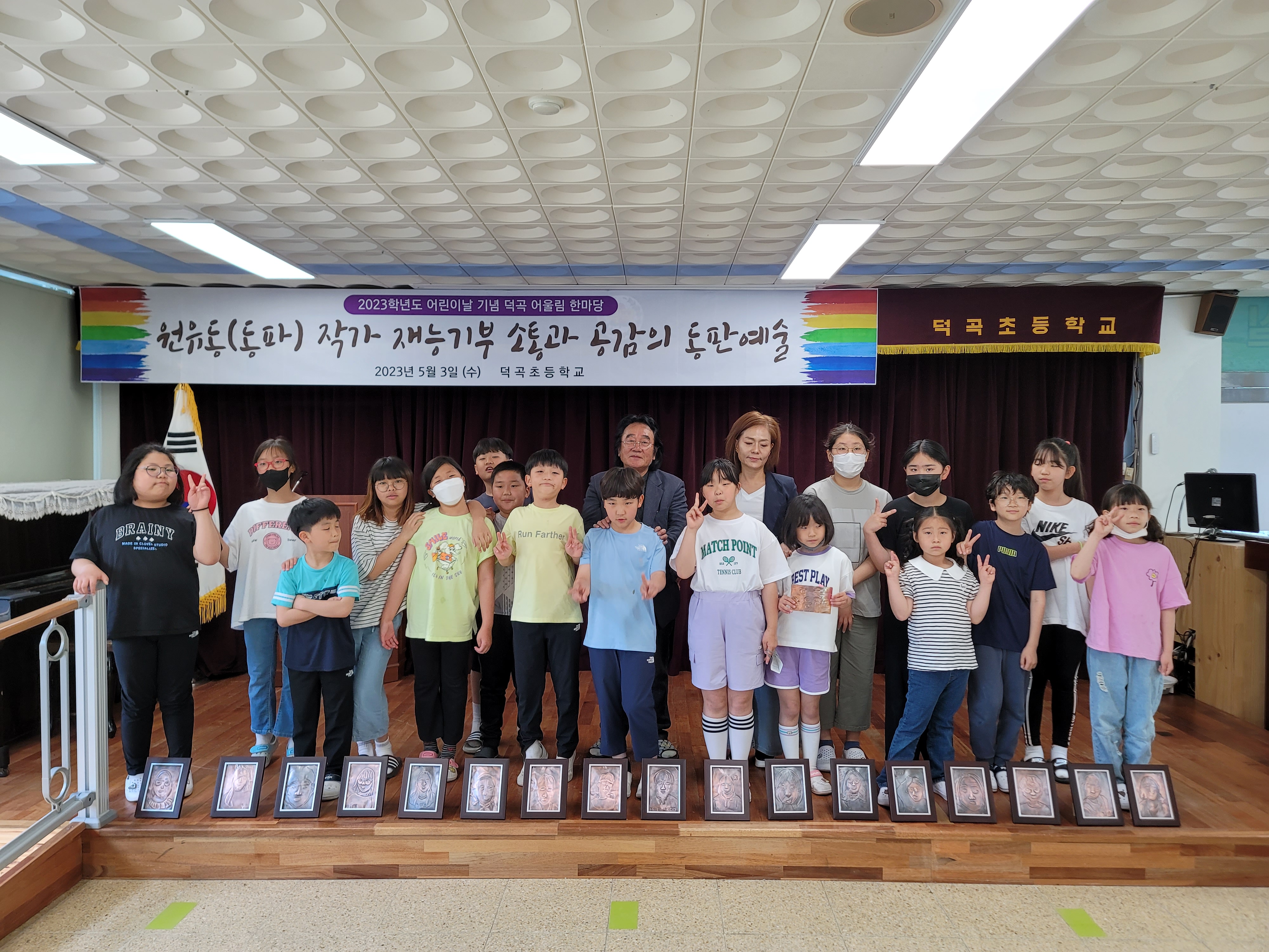 3교시부터는 우리 지역에 거주하시는 동판작가이신 원유동(동파) 선생님의 재능과 동판 기부로 우리 덕곡초 학생들이 자신의 자화상을 동판으로 표현하는 동판예술 체험 시간을 가졌다. 원유동(동파) 작가 선생님은 최근 우리 지역으로 전입하신 후 지역 내 주민센터에서 동판 작품전을 여시는 등 활발하게 작품활동을 하고 계시는 분으로써 4월 중순경 우리 덕곡초 학생들이 원유동 선생님의 전시회를 직접 관람하고 왔었다. 이러한 인연으로 원유동 선생님께서 우리 학생들에게 동판예술체험을 재능기부해주셨다. 우리 학생들은 원유동 선생님의 지도아래 금필로 동판에 자신의 얼굴을 표현하였다. 유명 작가님의 지도 아래 학생들은 처음 접해보는 동판예술이었지만 모두가 자신의 얼굴을 표현한 멋진 동판 작품을 완성할 수 있었다.