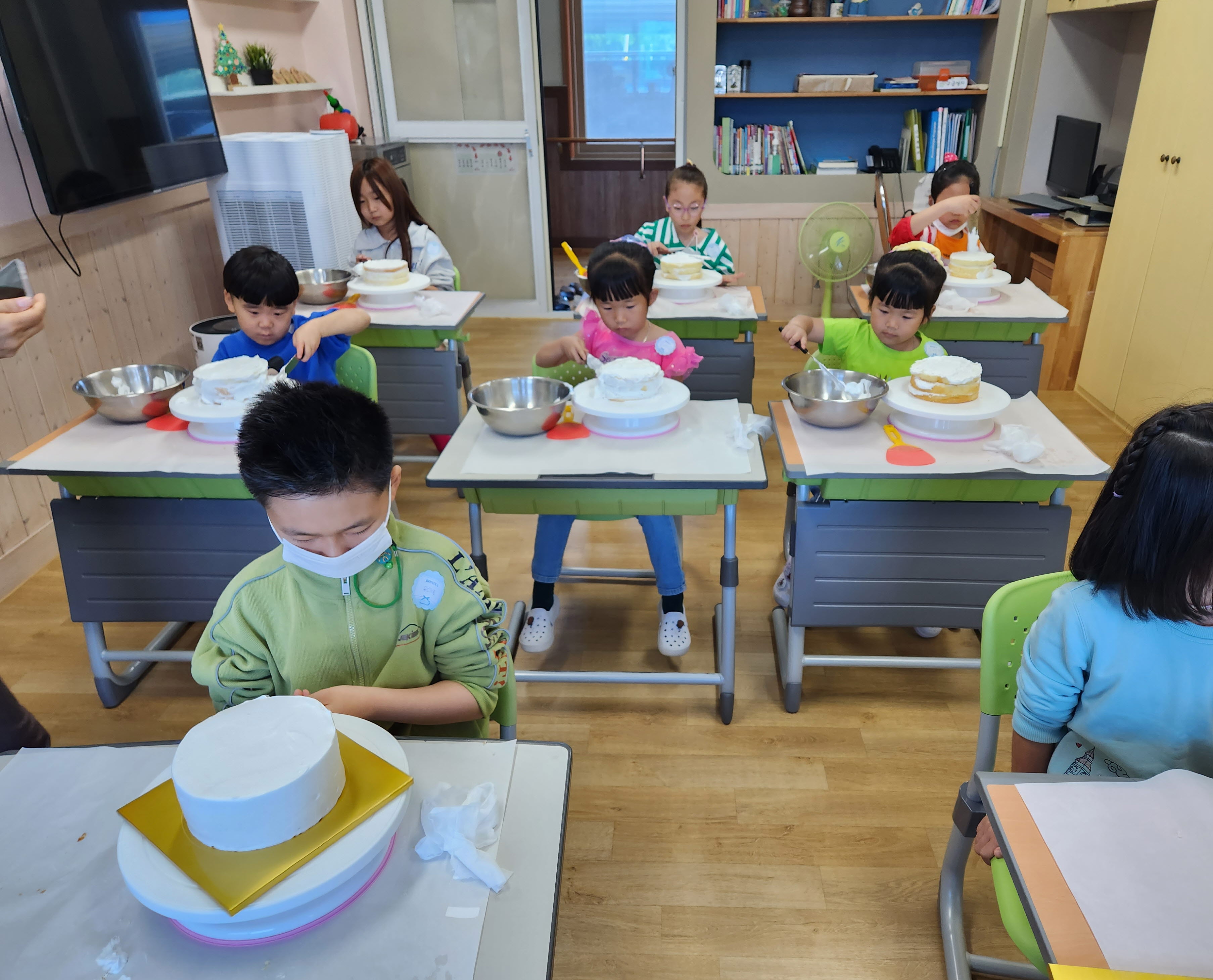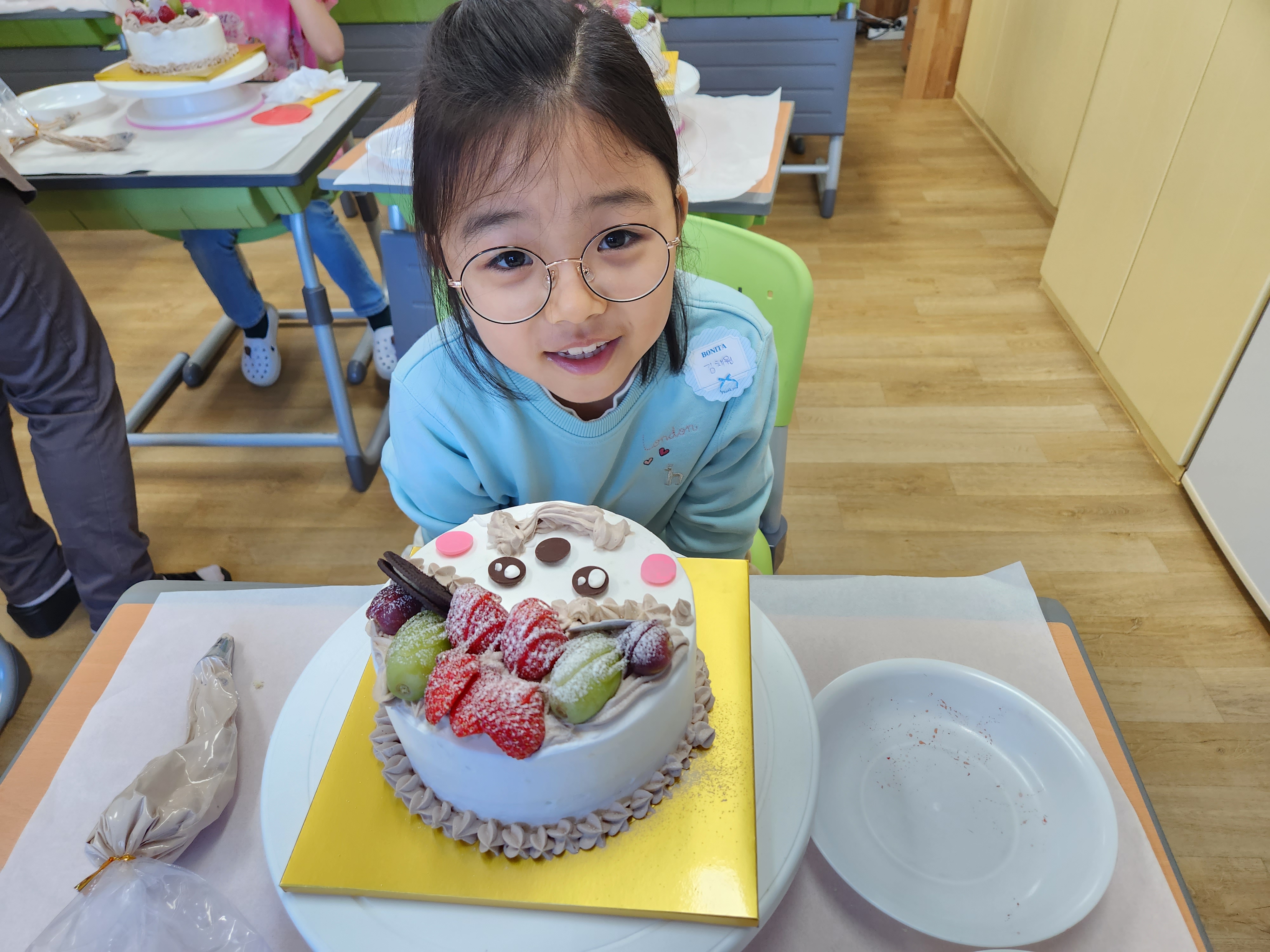 학생들은 돌림판 위에 빵을 올려두고 스페츌라를 사용하여 생크림을 발랐다. 아이들은 선생님의 설명에 따라 열심히 생크림을 바르고 과일을 올리며 어린 아이의 얼굴 모양으로 케이크를 꾸몄다.