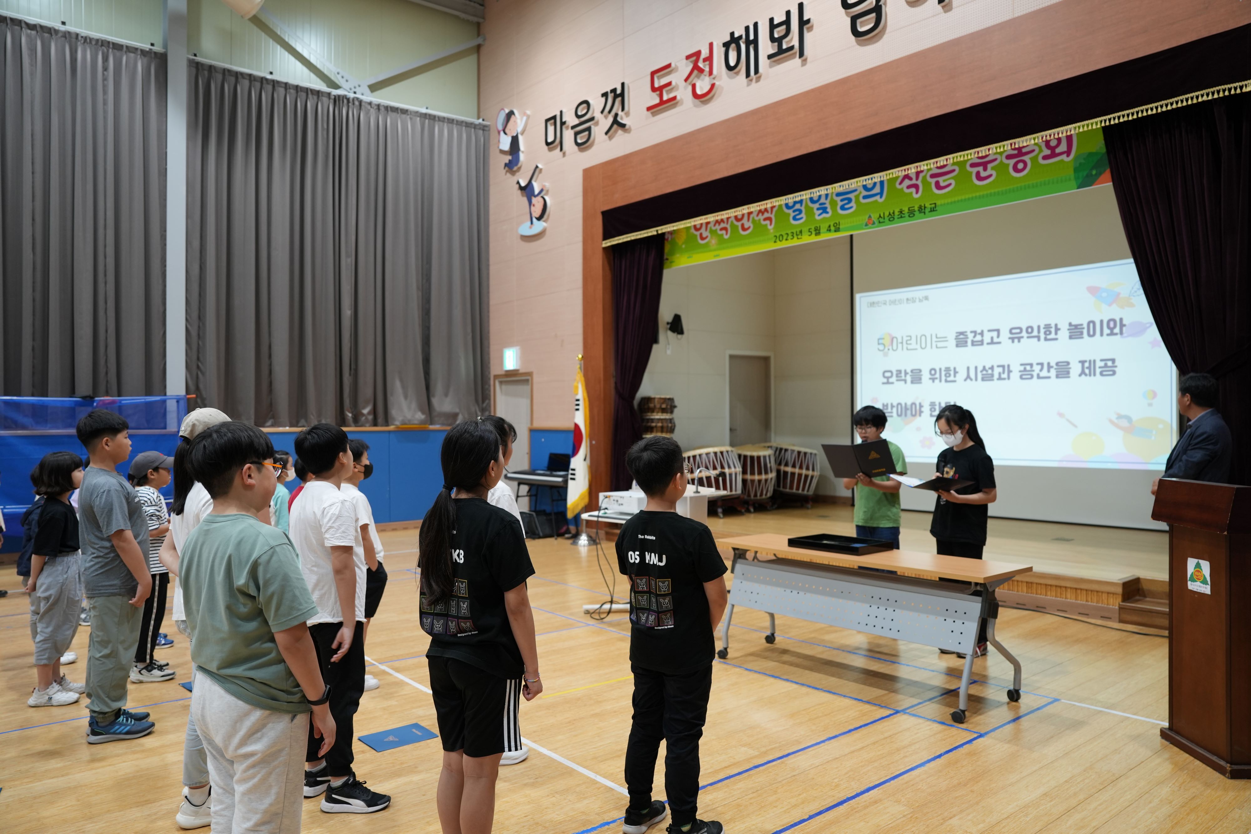□ 신성초등학교(교장 정도기)는 5월 4일(목), 별빛관 및 운동장에서 전교생을 대상으로 제101회 어린이날 기념식과 한마음 체육대회를 실시하였다. 이번 행사는 오랜만에 운동장에서 마스크를 벗고 이전에 코로나19로 인해 지친 몸과 마음을 회복하고자 어린이날을 기념하는 의미로 다채롭게 구성되었다.