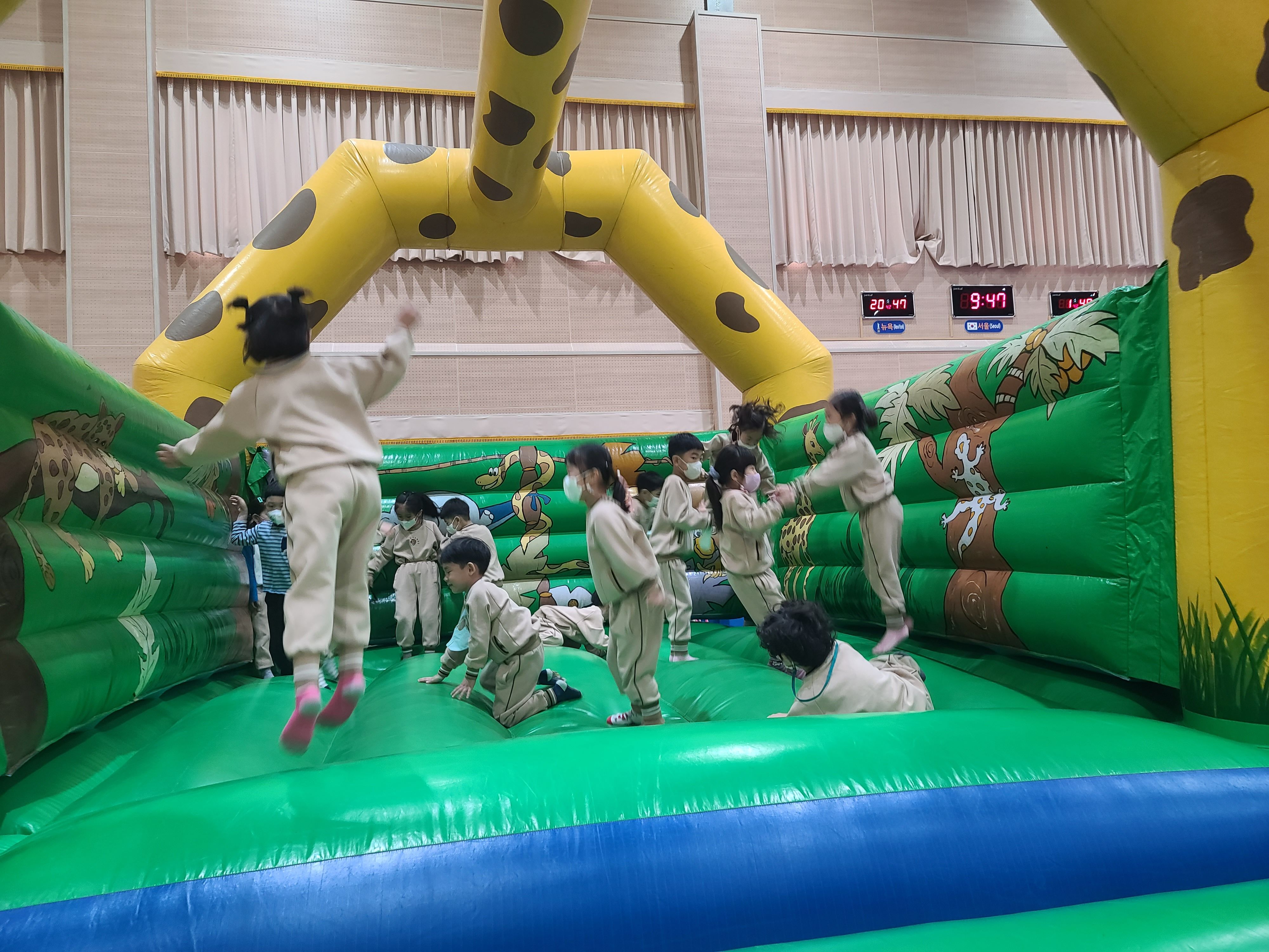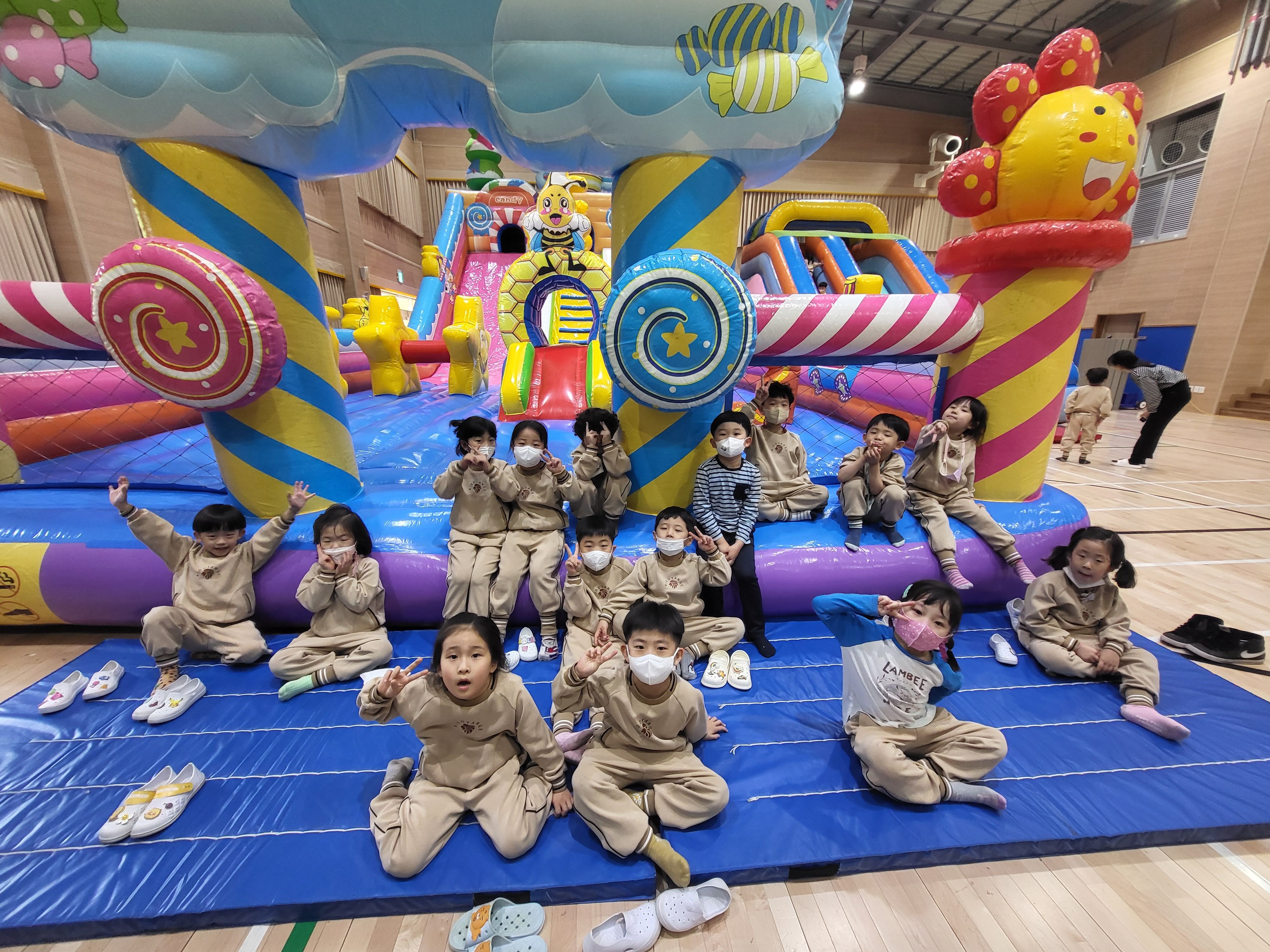□ 에어바운스 활동을 통해 놀이 속에서 재미와 즐거움을 느낄 수 있도록 활동을 준비하게 되었다. 활동 전 교실에서 안전교육을 충분히 이야기를 나누었고, 대형 바운스와 4인용 꼬마기차, 범퍼카, 기린바운스, 회전자전거를 하며 즐거움을 만끽하였다.