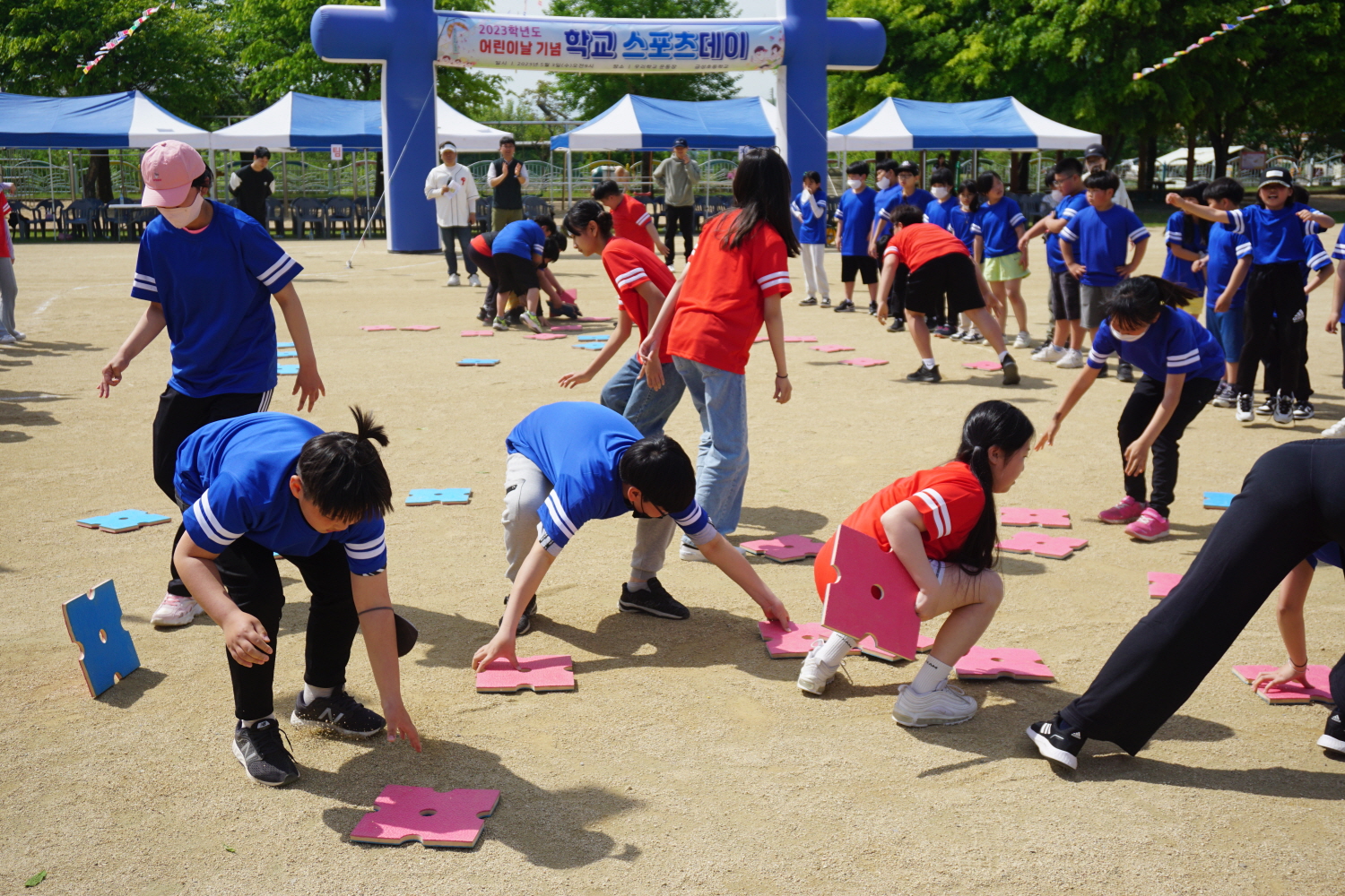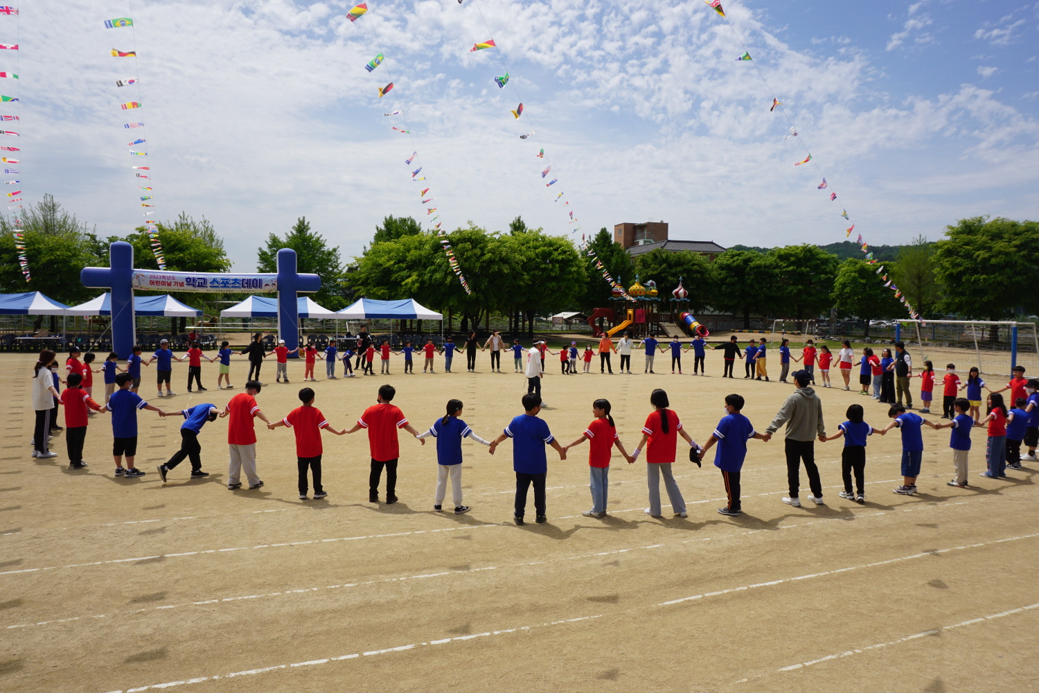 □ 금성초등학교(교장 김보영)는 101주년 어린이날을 맞이해 5월 3일 본교 운동장에서 학교스포츠데이 행사를 개최했다. 학생들은 홍팀과 청팀으로 나누어져 개회식부터 폐회식까지 서로 협력하고 배려하며 행사를 참여하고 즐겼다.