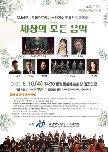 문경교육지원청(교육장 김현오)는 5월 10일(수) 14시30분 문경문화예술회관 대공연장에서 미래교육,자녀교육등 문경지역민과 학생,교직원 및 학부모의 기본소양 함양을 위해 재미있고 쉬운 음악과 해설로 누구나 즐길수 있는 음악회로 구성하는 CM심포니오케스트라와 스타가수 전유진이 함께하는 “세상의 모든 음악”음악회를 진행한다.