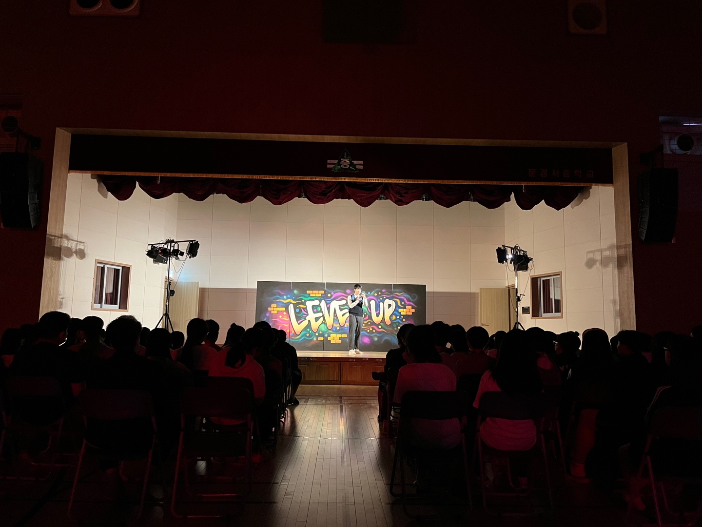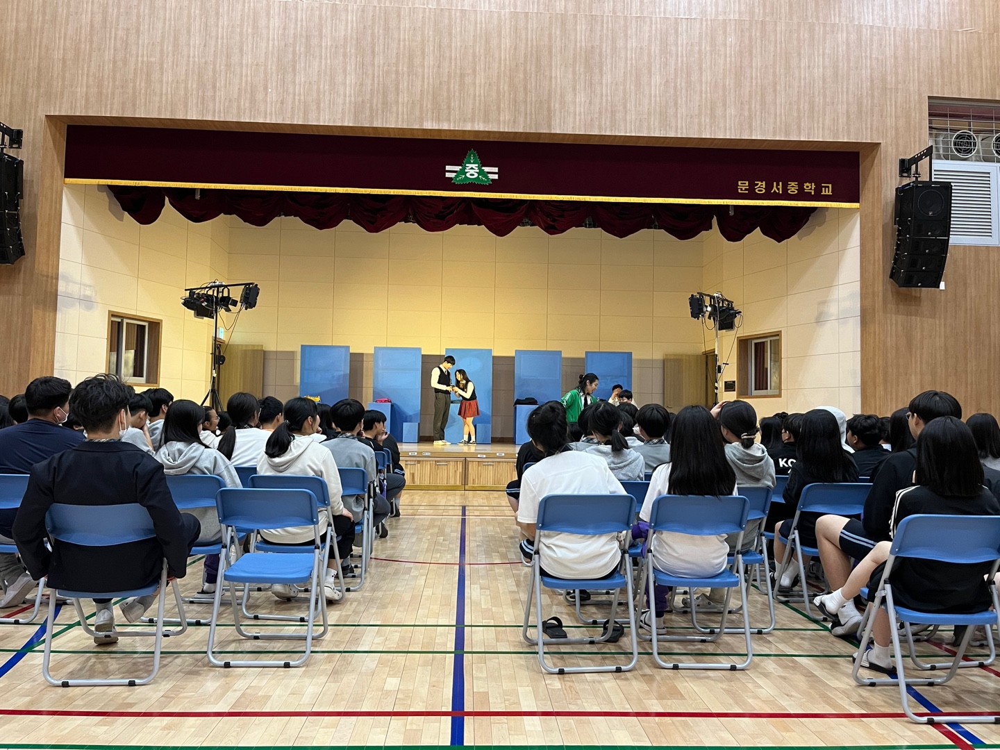 □ 문경서중학교(교장 황희중)의 전교생과 교직원들은 2023년 5월 4일(목) 본교 주흘관에서 청소년 공감 뮤지컬 ‘레벨업’ 공연을 관람하였다. 진로·직업 체험의 일환으로 추진된 이번 공연 관람으로 학생들의 꿈과 희망이 업그레이드되는 계기가 되었다.