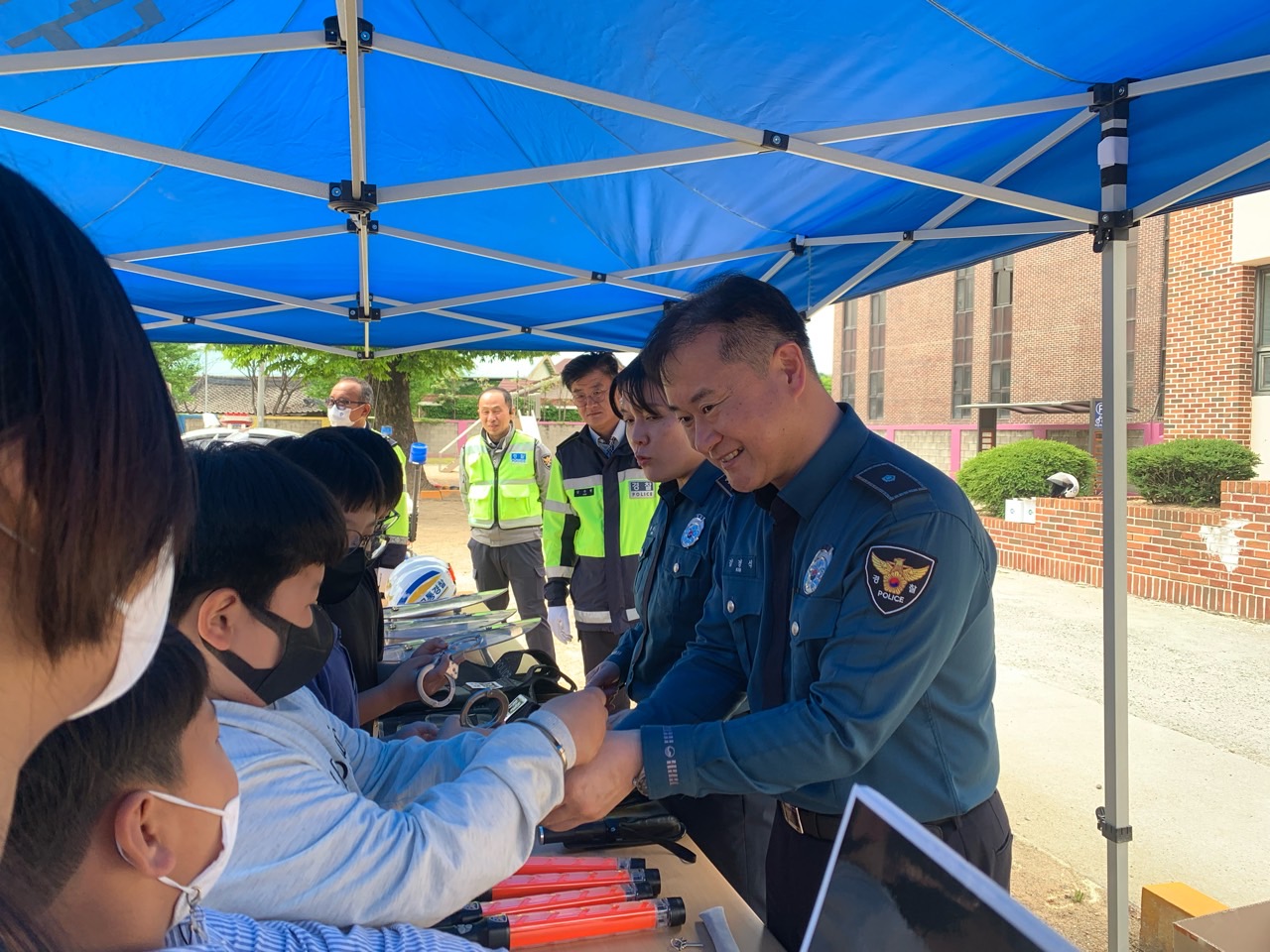 진로 특강 후에는 운동장에서 실제 사용하는 경찰 장비와 순찰차, 싸이카 등을 학생들이 직접 체험해보는 시간을 가졌다. 경찰관 체험과 더불어 아동의 실종예방을 위한 지문 등 사전등록 또한 이루어졌다.
