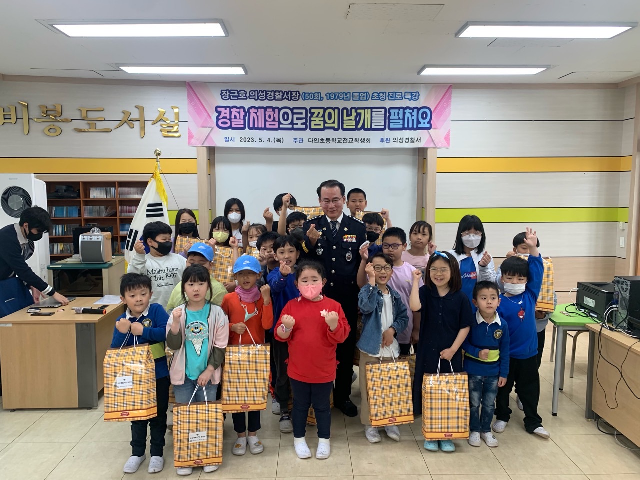 다인초등학교(교장 김익한)는 5월 4일(목) 장근호 의성경찰서장을 초청하여 전교생을 대상으로 하는 진로 특강 및 경찰관 체험 행사를 실시하였다.