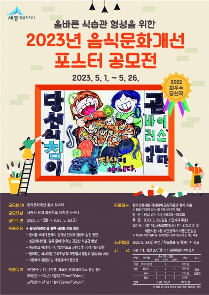 [금요저널] 세종특별자치시가 어린이들의 건강한 식생활 습관을 도모하기 위해 지난 1일부터 오는 26일까지 초등학생을 대상으로 ‘2023년 음식문화개선 포스터 공모전’을 개최한다.
