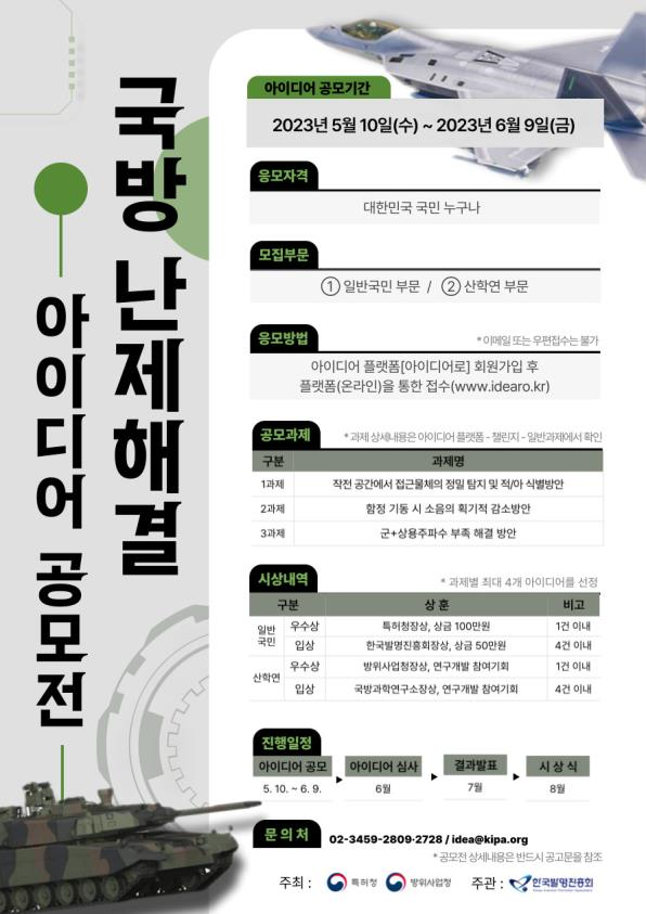 특허청과 방위사업청이 공동으로 개최하며 산·학·연과 일반 국민 부문으로 나누어 접수를 받는다.