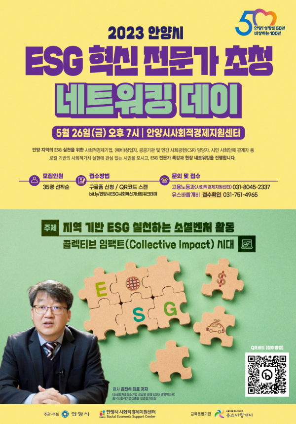 [금요저널] 안양시가 ESG 혁신전문가 초청해 특강 및 네트워킹데이를 오는 26일 오후 7시 동안구 평촌동의 안양시사회적경제지원센터에서 개최한다고 11일 밝혔다.