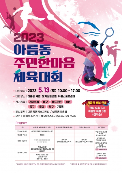 아름동 주민한마음 체육대회는 식전공연, 개회식에 이어 수영, 풋살, 배드민턴, 탁구 경기가 아름스포츠센터에서 진행되며 오가낭뜰 체육공원에서는 족구, 게이트볼 경기가 각각 진행된다.