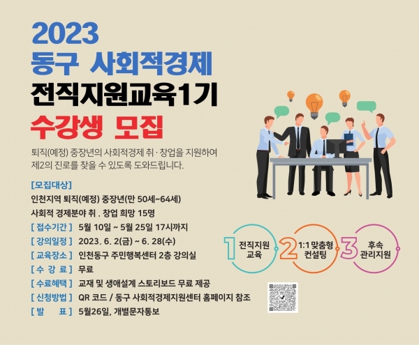[금요저널] 인천 동구가 오는 25일까지 퇴직자의 사회적경제 분야·창업 지원을 위한 ‘2023년 사회적경제 전직 지원 교육 1기’ 참여자를 모집한다.