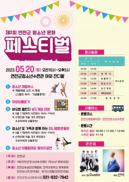 재단 관계자는 “제2회 청소년 문화페스티벌”을 통해 청소년을 이해하고 서로 소통의 장이 될 수 있는 연천군의 행사가 될 수 있도록 노력하겠다”고 말했다.