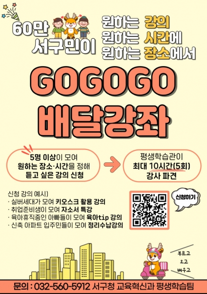 [금요저널] 인천 서구가 구민이 듣고 싶은 평생학습 강의를 원하는 시간, 장소에 강사를 파견해 진행하는 ‘GOGOGO 배달강좌’를 운영한다고 15일 밝혔다.