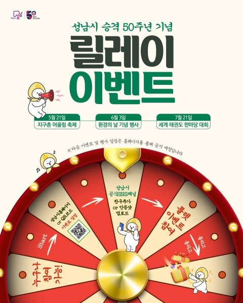 릴레이 홍보는 성남시가 연중 개최하는 10여 개 행사에 시 승격 50주년 홍보 부스를 설치해 운영하며 시 공식 SNS 친구추가 등 이벤트 참여자에게는 룰렛 돌리기를 통해 당첨된 50주년 홍보 물품을 증정할 예정이다.