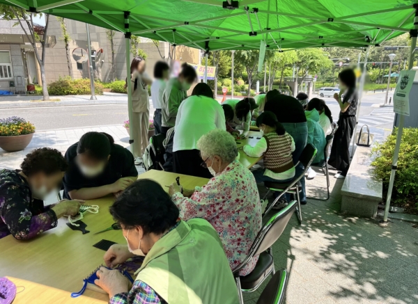 [금요저널] 군포시청소년재단 학교밖청소년지원센터는 지난 10일 군포시 삼성마을 1단지 경로당 앞에서 지역주민을 위한 핸드위빙 교육봉사 활동을 진행했다.
