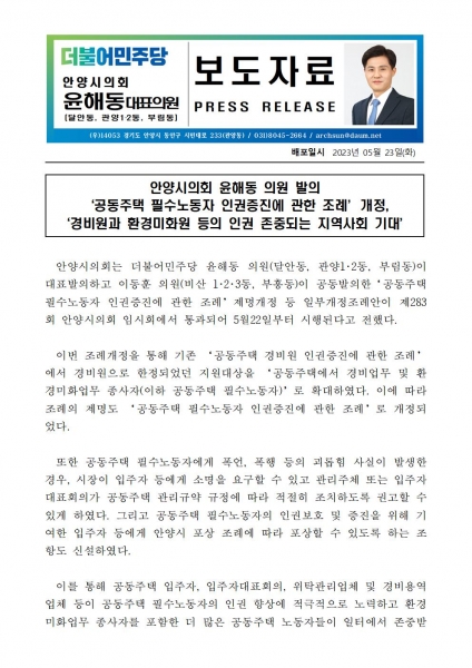 [금요저널] 안양시의회는 더불어민주당 윤해동 의원이 대표발의하고 이동훈 의원이 공동발의한‘공동주택 필수노동자 인권증진에 관한 조례’제명개정 등 일부개정조례안이 제283회 안양시의회 임시회에서 통과되어 5월22일부터 시행된다고 전했다.