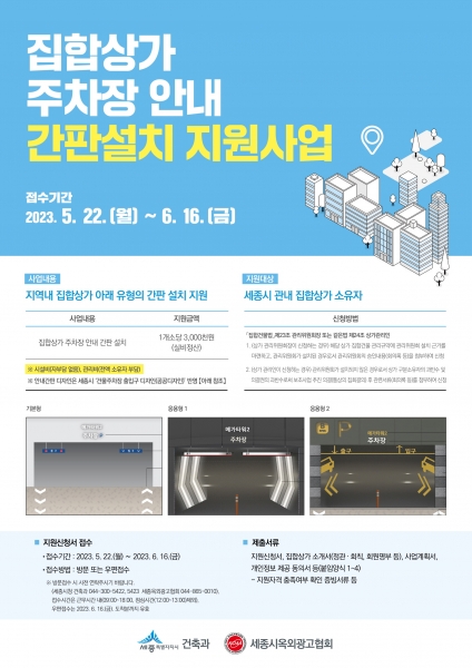 [금요저널] 세종특별자치시가 관내 집합상가 방문객들이 주차장을 보다 쉽게 찾을 수 있도록 집합상가에 ‘주차장 안내 간판 설치’를 지원하기로 하고 지난 22일부터 다음달 19일까지 신청을 받는다.