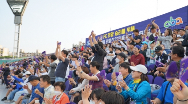 이날 응원 대축제에 참석한 구성원들은 FC안양을 상징하는 보라색 응원 도구를 손에 쥐고 열정적인 응원을 펼쳤다.