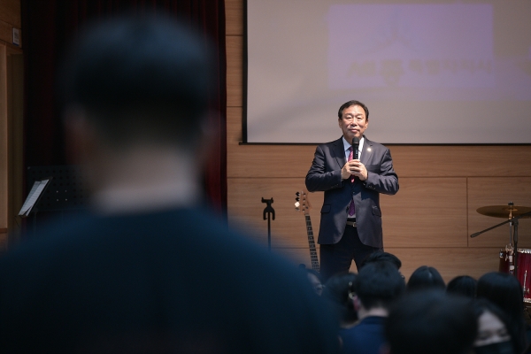 최민호 시장은 이날 장영실고 강당에서 300여명의 재학생들에게 ‘나만의 스토리텔링’을 주제로 이야기를 풀어나갔다.