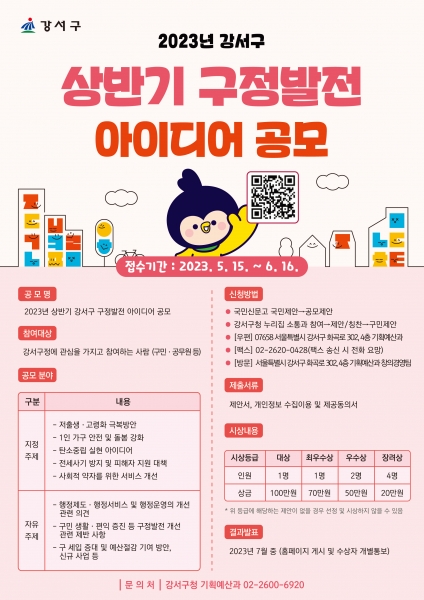 구 관계자는 “주민들의 입장에서 구의 발전에 실질적인 도움이 되는 정책과 사업을 발굴하기 위해 이번 공모전을 준비했다”며 “강서구를 더 빛나게 해줄 구정 발전 아이디어 공모에 많은 관심과 참여 부탁드린다”고 말했다.