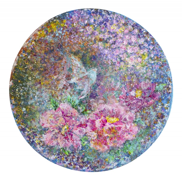 정선 작가는 민화의 장식미와 상징성을 차용한 전통적 이미지에, 화려한 색감과 추상적 여백을 통한 절제된 민화의 특성을 살린 작품을 보여준다.