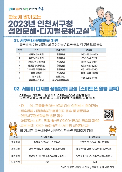 한글, 수학 등 기초학력 향상과 함께 스마트폰 활용 교육이 운영되며 60세 이상 성인남녀는 누구나 가까운 곳에서 학습을 받을 수 있다.