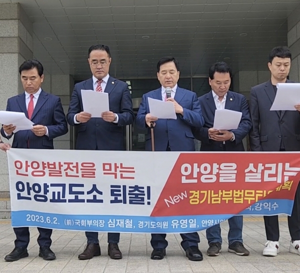 [금요저널] 심재철 前국회부의장이 2일 안양시청에서 ‘안양교도소 완전 이전 촉구’ 기자회견을 가졌다.