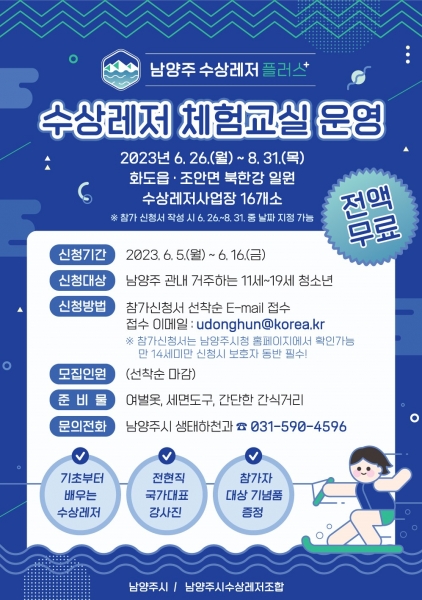 한편 시는 어린이와 청소년들이 수상레저를 쉽고 재미있게 체험할 수 있도록 ‘북한강 수상레저 플러스’사업을 추진하고 있으며 이번 프로그램과 관련된 자세한 내용은 남양주시 블로그 또는 남양주시청 홈페이지 내 모집공고/일자리에서 확인할 수 있다.