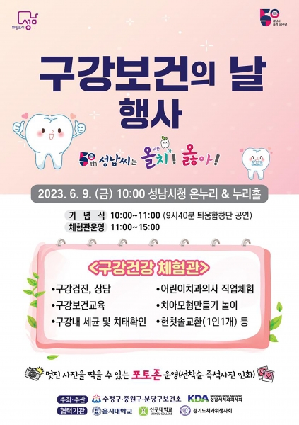 ‘성남시는 올치 옳아’를 주제로 한 이날 행사는 구강건강에 관한 시민 이해와 관심을 높이기 위해 마련된다.