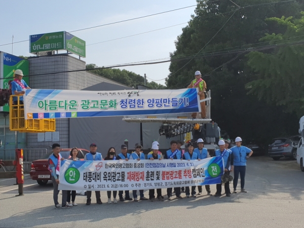 양평군 광고협회는 “회원들과 연계를 통해 지역별 옥외광고물에 대한 관리를 지속적으로 실시해 안전사고를 사전에 방지하고 청렴한 양평만들기에 기여할 수 있도록 회원들과 불법광고물 근절을 위해 노력하겠다”고 말했다 양평군청 도시과장은 “옥외광고물에 대한 사전점검 및 철거를 통해 태풍에 의한 안전사고를 방지하고 불법 광고물 근절을 통한 아름다운 광고문화가 정착되어 청렴한 양평만들기에 최선을 다해 노력하겠다”고 밝혔다.
